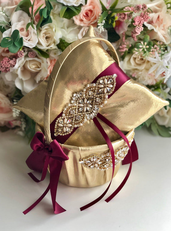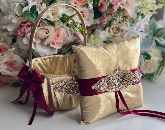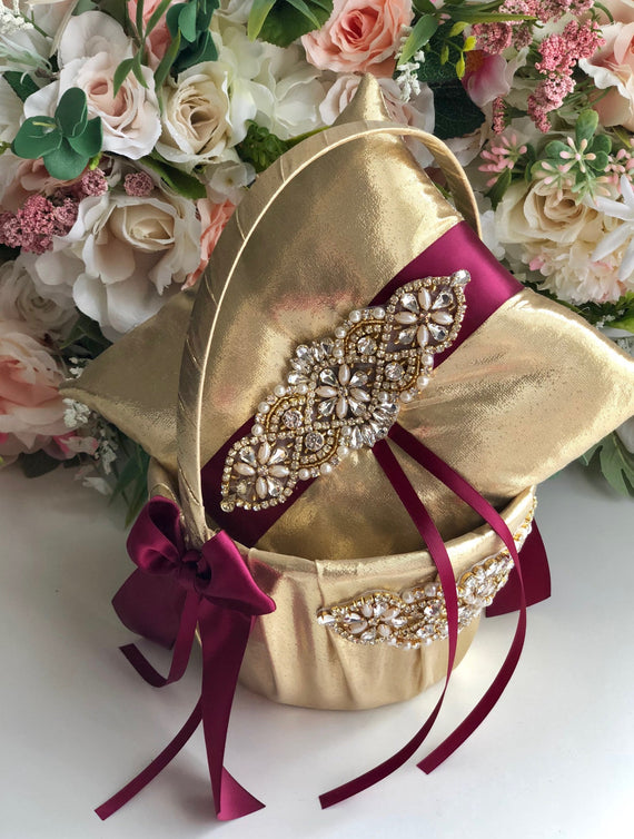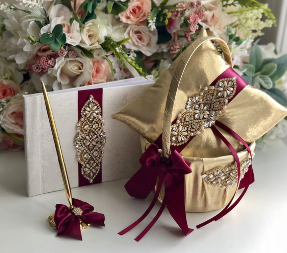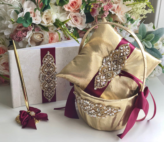 Gold Burgundy Flower Girl Basket, Ring Bearer Pillow and Guest Book Set