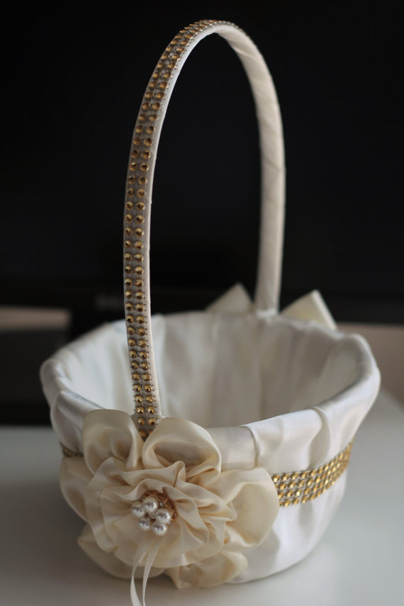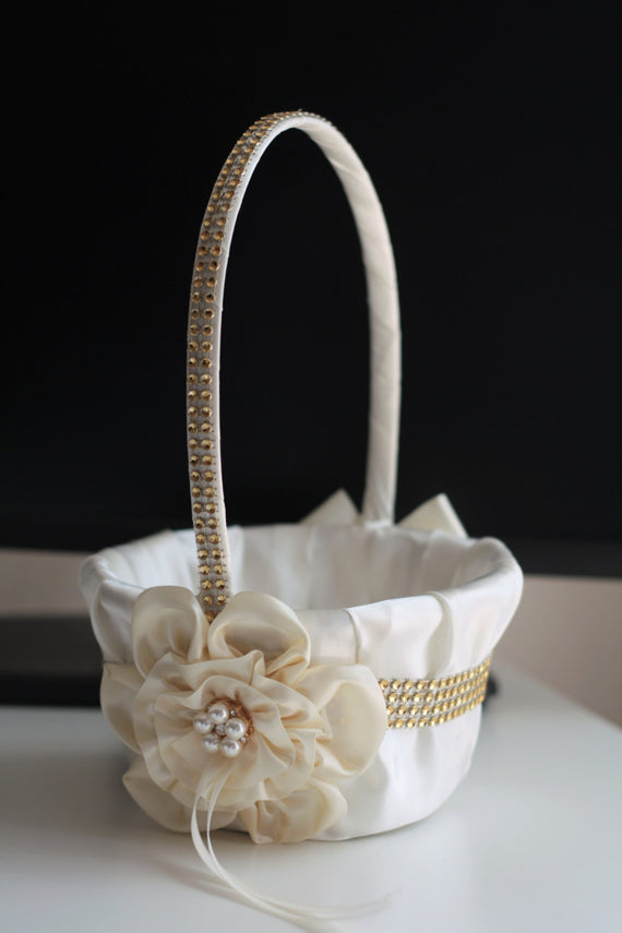 Ivory ring bearer pillow + ivory flower girl basket, gold wedding pillow + Ivory wedding basket, ivory gold pillow basket set, Brooch bearer