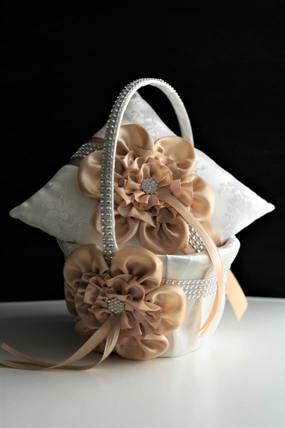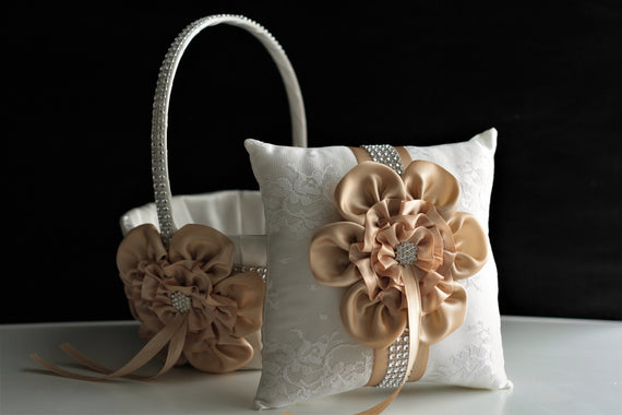 Enjoy your wedding with this beautiful beige flower girl basket and ring bearer pillow set.