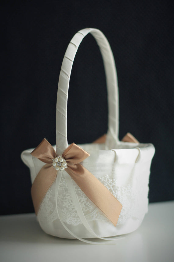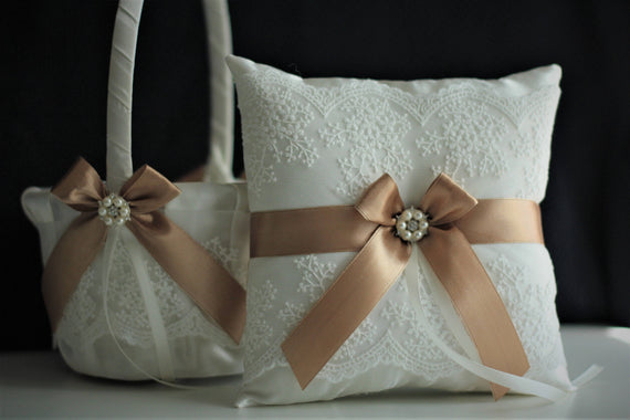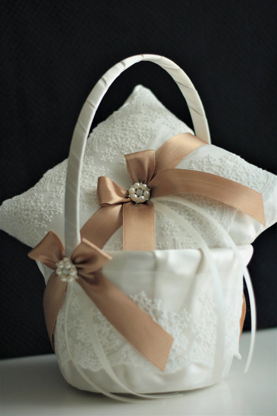 Beige Flower Girl Basket and Ring Bearer Pillow Wedding Set
