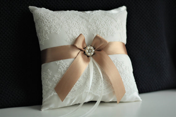 We cover our classic ring pillows with lace and wrap it with ribbon bow 🎀 of your color’s choice. Then on the top of it we decorate it with beautiful shiny brooch to make it look even better!