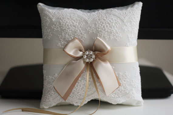 We cover our classic ring pillows with lace and wrap it with ribbon bow 🎀 of your color’s choice. Then on the top of it we decorate it with beautiful shiny brooch to make it look even better!