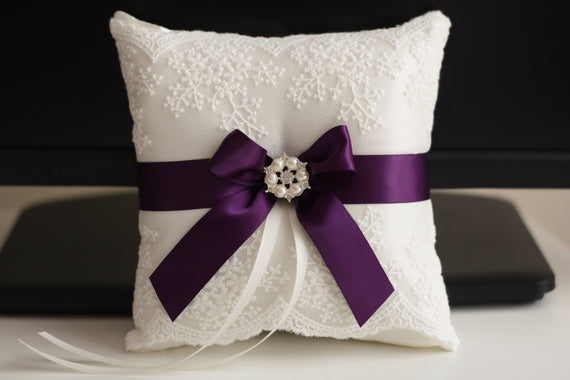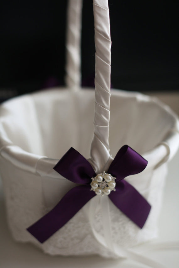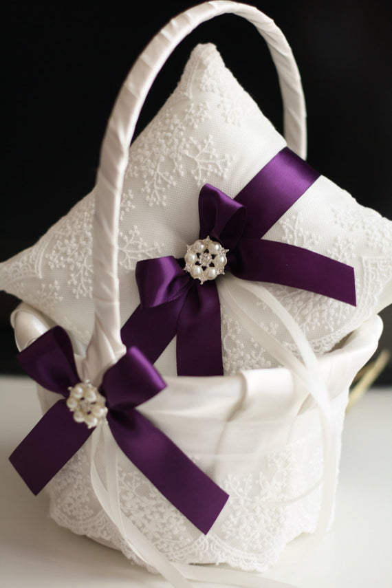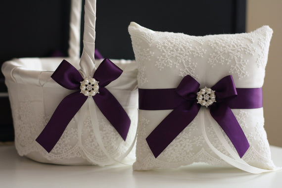Plum Wedding Basket & Plum Ring Bearer Pillow \ Egg Plant Bearer Pillow + Plum Flower Girl Basket \ Ivory Plum Wedding Pillow Basket Set
