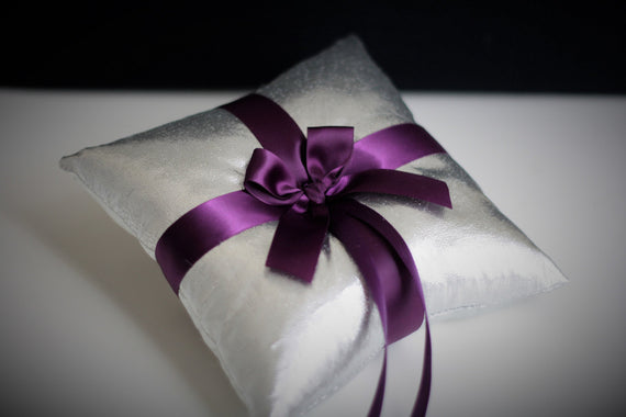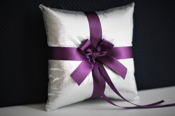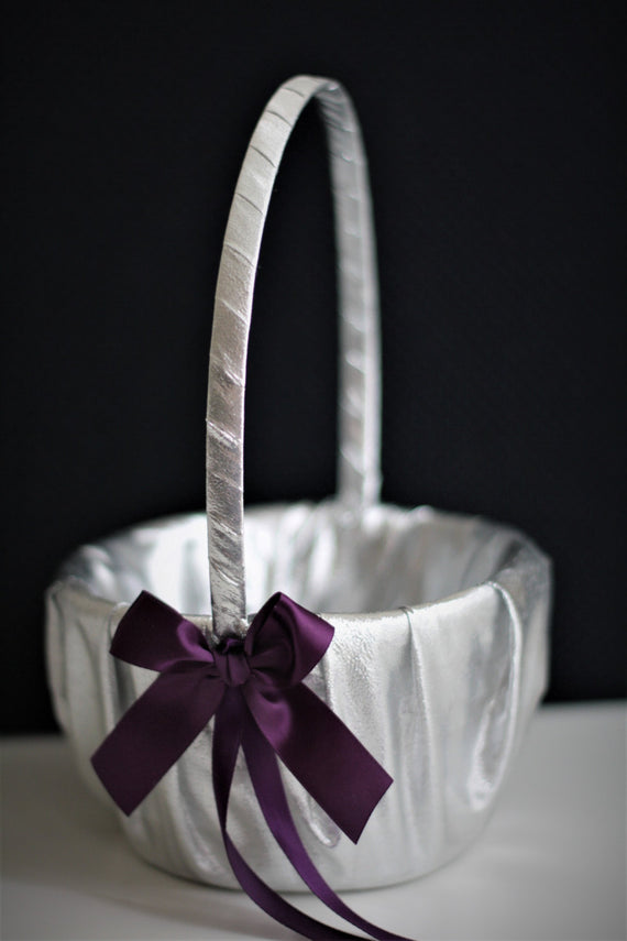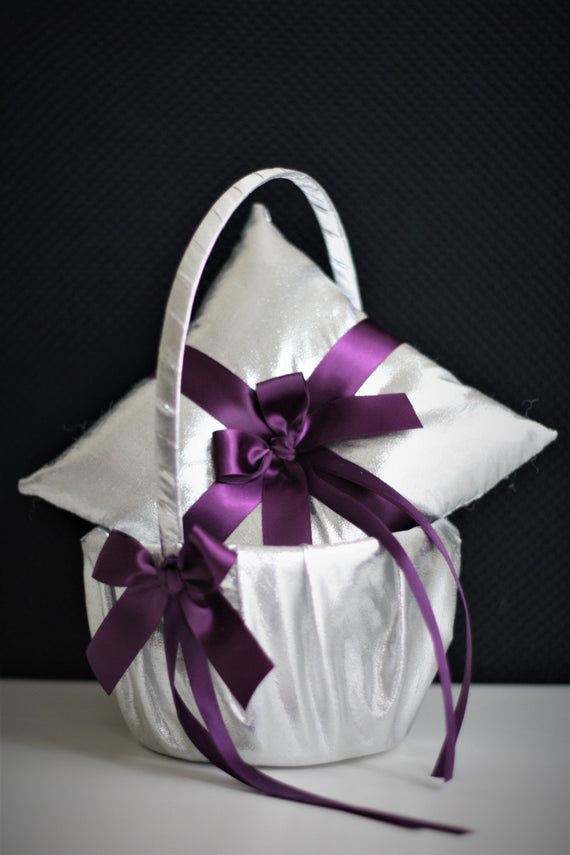 Silver Ring bearer Pillow, Plum Flower Girl Basket, Plum Wedding Basket, Plum Wedding Pillow, Plum Ring Holder, Silver pillow basket set